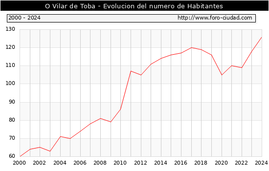el numero de habitantes en O Vilar de Toba era de 126, 8 habitantes mas que el en el año 2023. En el grafico siguiente se puede ver cuantos habitantes tiene O Vilar de Toba a lo largo de los años.