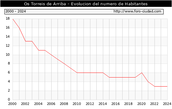 el numero de habitantes en Os Torreis de Arriba era de 3, igual numero de habitantes que el en el año 2023. En el grafico siguiente se puede ver cuantos habitantes tiene Os Torreis de Arriba a lo largo de los años.