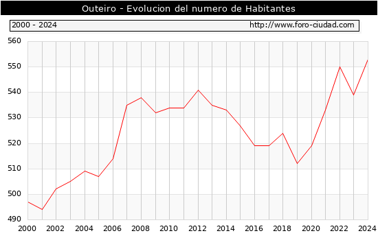el numero de habitantes en Outeiro era de 553, 14 habitantes mas que el en el año 2023. En el grafico siguiente se puede ver cuantos habitantes tiene Outeiro a lo largo de los años.