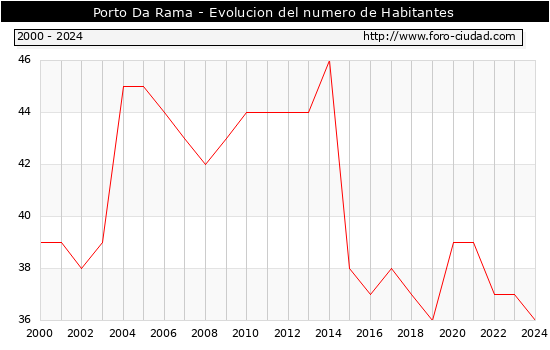 Segun los datos publicados por el INE a 1 de Enero de 2024 el numero de habitantes en Porto Da Rama era de 36, 1 habitantes menos que el en el año 2023. En el grafico siguiente se puede ver cuantos habitantes tiene Porto Da Rama a lo largo de los años.