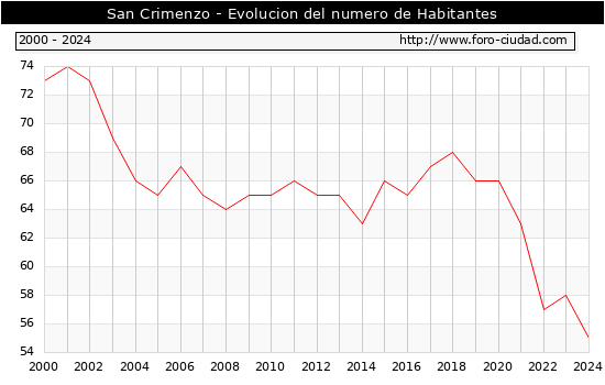 el numero de habitantes en San Crimenzo era de 55, 3 habitantes menos que el en el año 2023. En el grafico siguiente se puede ver cuantos habitantes tiene San Crimenzo a lo largo de los años.