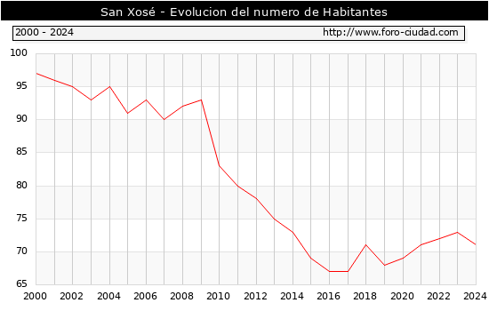 el numero de habitantes en San Xosé era de 71, 2 habitantes menos que el en el año 2023. En el grafico siguiente se puede ver cuantos habitantes tiene San Xosé a lo largo de los años.
