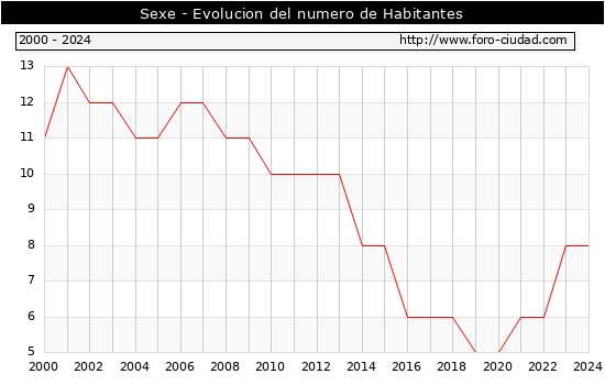 el numero de habitantes en Sexe era de 8, igual numero de habitantes que el en el año 2023. En el grafico siguiente se puede ver cuantos habitantes tiene Sexe a lo largo de los años.