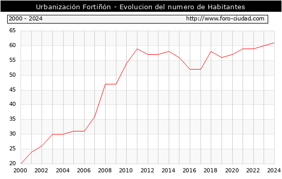 Segun los datos publicados por el INE a 1 de Enero de 2024 el numero de habitantes en Urbanización Fortiñón era de 61, 1 habitantes mas que el en el año 2023. En el grafico siguiente se puede ver cuantos habitantes tiene Urbanización Fortiñón a lo largo de los años.
