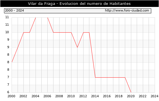 el numero de habitantes en Vilar da Fraga era de 6, igual numero de habitantes que el en el año 2023. En el grafico siguiente se puede ver cuantos habitantes tiene Vilar da Fraga a lo largo de los años.