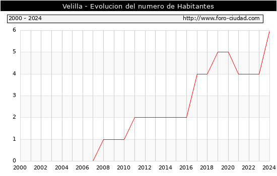 el numero de habitantes en Velilla era de 6, 2 habitantes mas que el en el año 2023. En el grafico siguiente se puede ver cuantos habitantes tiene Velilla a lo largo de los años.