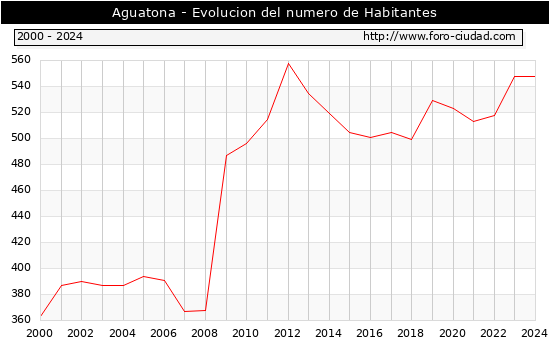 el numero de habitantes en Aguatona era de 548, igual numero de habitantes que el en el año 2023. En el grafico siguiente se puede ver cuantos habitantes tiene Aguatona a lo largo de los años.