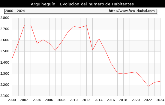 el numero de habitantes en Arguineguín era de 2.235, 11 habitantes mas que el en el año 2023. En el grafico siguiente se puede ver cuantos habitantes tiene Arguineguín a lo largo de los años.