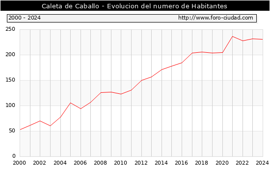 el numero de habitantes en Caleta de Caballo era de 231, 1 habitantes menos que el en el año 2023. En el grafico siguiente se puede ver cuantos habitantes tiene Caleta de Caballo a lo largo de los años.
