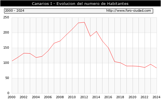 el numero de habitantes en Canarios I era de 84, 12 habitantes menos que el en el año 2023. En el grafico siguiente se puede ver cuantos habitantes tiene Canarios I a lo largo de los años.