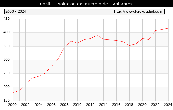 el numero de habitantes en Conil era de 416, 4 habitantes mas que el en el año 2023. En el grafico siguiente se puede ver cuantos habitantes tiene Conil a lo largo de los años.