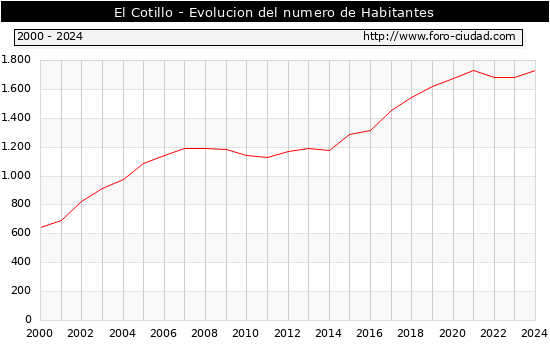 el numero de habitantes en El Cotillo era de 1.730, 46 habitantes mas que el en el año 2023. En el grafico siguiente se puede ver cuantos habitantes tiene El Cotillo a lo largo de los años.