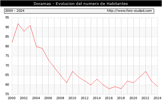 el numero de habitantes en Doramas era de 59, 3 habitantes menos que el en el año 2023. En el grafico siguiente se puede ver cuantos habitantes tiene Doramas a lo largo de los años.