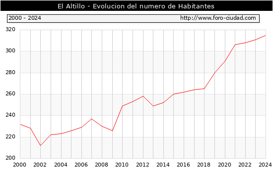 el numero de habitantes en El Altillo era de 315, 4 habitantes mas que el en el año 2023. En el grafico siguiente se puede ver cuantos habitantes tiene El Altillo a lo largo de los años.