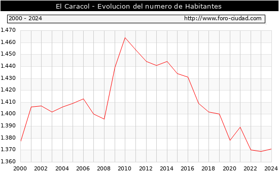 el numero de habitantes en El Caracol era de 1.371, 2 habitantes mas que el en el año 2023. En el grafico siguiente se puede ver cuantos habitantes tiene El Caracol a lo largo de los años.