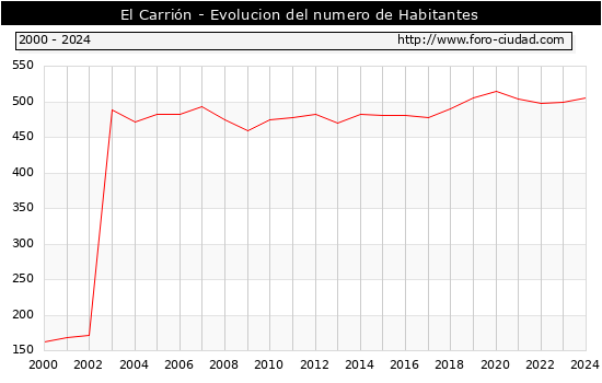 el numero de habitantes en El Carrión era de 505, 6 habitantes mas que el en el año 2023. En el grafico siguiente se puede ver cuantos habitantes tiene El Carrión a lo largo de los años.