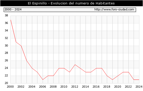 el numero de habitantes en El Espinillo era de 21, igual numero de habitantes que el en el año 2023. En el grafico siguiente se puede ver cuantos habitantes tiene El Espinillo a lo largo de los años.