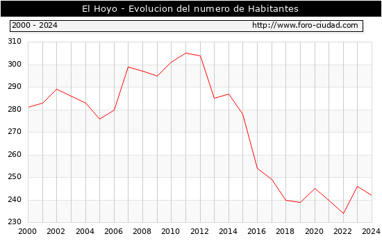 el numero de habitantes en El Hoyo era de 242, 4 habitantes menos que el en el año 2023. En el grafico siguiente se puede ver cuantos habitantes tiene El Hoyo a lo largo de los años.