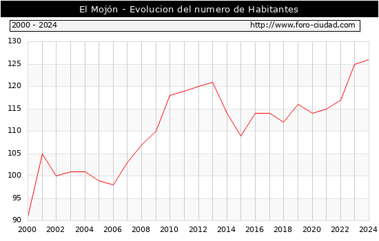 el numero de habitantes en El Mojón era de 126, 1 habitantes mas que el en el año 2023. En el grafico siguiente se puede ver cuantos habitantes tiene El Mojón a lo largo de los años.