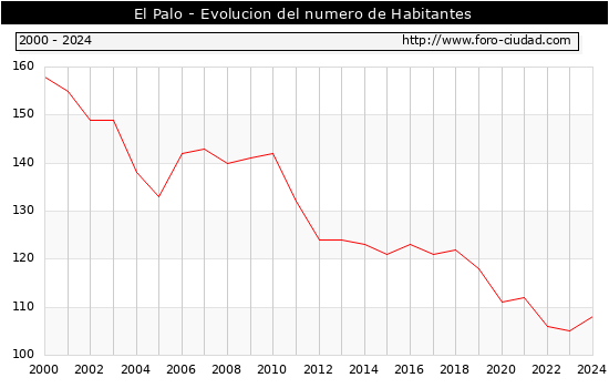 Segun los datos publicados por el INE a 1 de Enero de 2024 el numero de habitantes en El Palo era de 108, 3 habitantes mas que el en el año 2023. En el grafico siguiente se puede ver cuantos habitantes tiene El Palo a lo largo de los años.