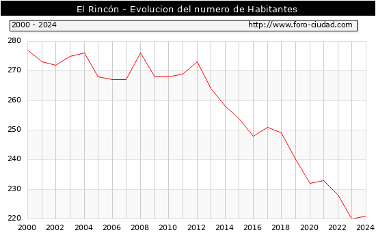 el numero de habitantes en El Rincón era de 221, 1 habitantes mas que el en el año 2023. En el grafico siguiente se puede ver cuantos habitantes tiene El Rincón a lo largo de los años.