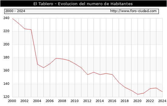 el numero de habitantes en El Tablero era de 128, 6 habitantes menos que el en el año 2023. En el grafico siguiente se puede ver cuantos habitantes tiene El Tablero a lo largo de los años.