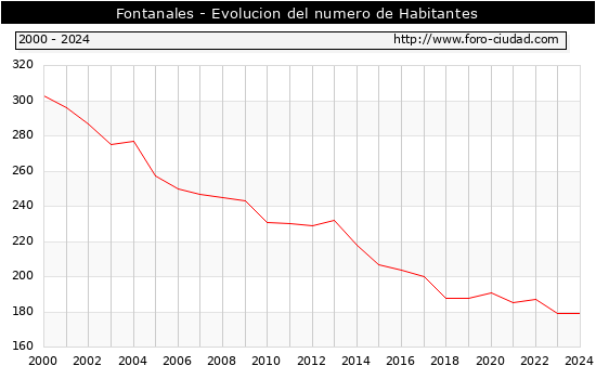 el numero de habitantes en Fontanales era de 179, igual numero de habitantes que el en el año 2023. En el grafico siguiente se puede ver cuantos habitantes tiene Fontanales a lo largo de los años.