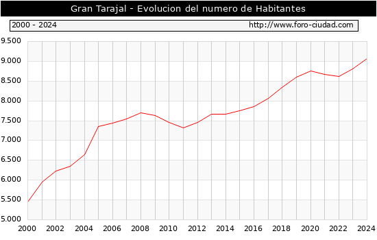 el numero de habitantes en Gran Tarajal era de 9.075, 265 habitantes mas que el en el año 2023. En el grafico siguiente se puede ver cuantos habitantes tiene Gran Tarajal a lo largo de los años.