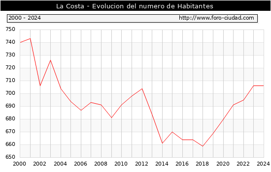 el numero de habitantes en La Costa era de 706, igual numero de habitantes que el en el año 2023. En el grafico siguiente se puede ver cuantos habitantes tiene La Costa a lo largo de los años.