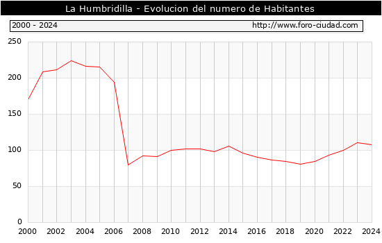 el numero de habitantes en La Humbridilla era de 108, 3 habitantes menos que el en el año 2023. En el grafico siguiente se puede ver cuantos habitantes tiene La Humbridilla a lo largo de los años.