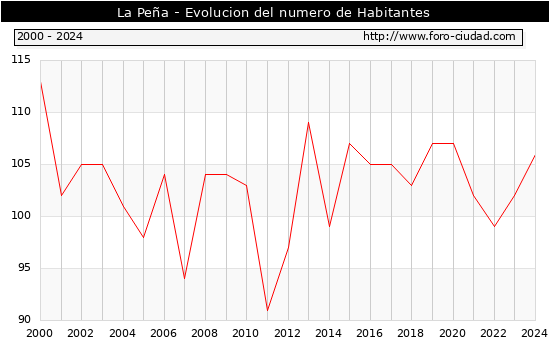 el numero de habitantes en La Peña era de 106, 4 habitantes mas que el en el año 2023. En el grafico siguiente se puede ver cuantos habitantes tiene La Peña a lo largo de los años.