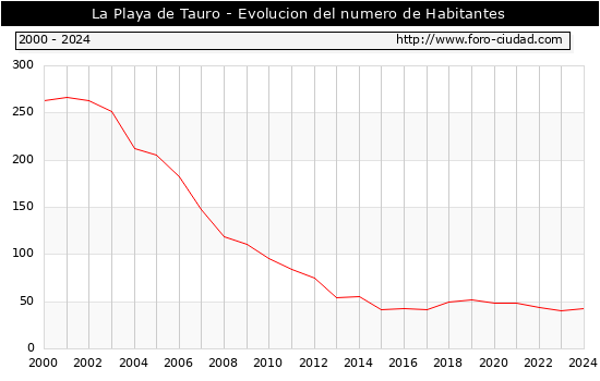 el numero de habitantes en La Playa de Tauro era de 43, 3 habitantes mas que el en el año 2023. En el grafico siguiente se puede ver cuantos habitantes tiene La Playa de Tauro a lo largo de los años.