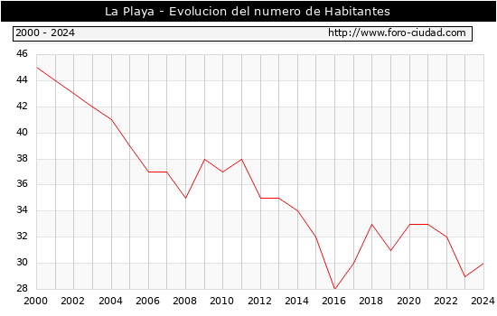 el numero de habitantes en La Playa era de 30, 1 habitantes mas que el en el año 2023. En el grafico siguiente se puede ver cuantos habitantes tiene La Playa a lo largo de los años.