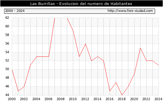 el numero de habitantes en Las Burrillas era de 51, 1 habitantes menos que el en el año 2023. En el grafico siguiente se puede ver cuantos habitantes tiene Las Burrillas a lo largo de los años.
