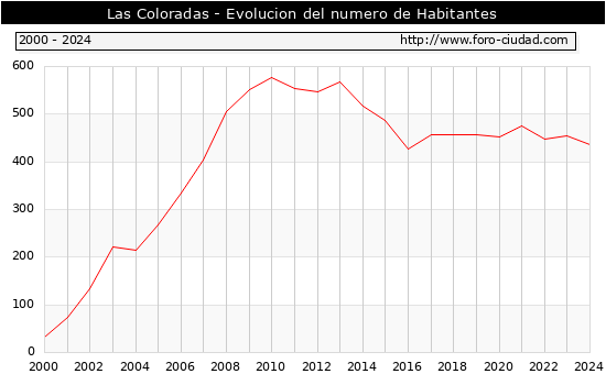 el numero de habitantes en Las Coloradas era de 436, 18 habitantes menos que el en el año 2023. En el grafico siguiente se puede ver cuantos habitantes tiene Las Coloradas a lo largo de los años.