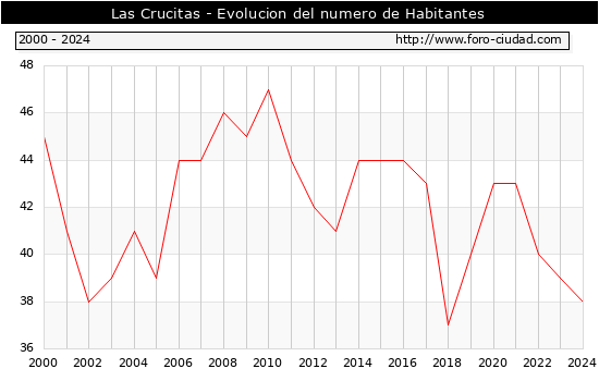 el numero de habitantes en Las Crucitas era de 38, 1 habitantes menos que el en el año 2023. En el grafico siguiente se puede ver cuantos habitantes tiene Las Crucitas a lo largo de los años.