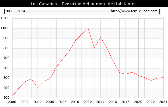 el numero de habitantes en Los Canarios era de 505, 5 habitantes mas que el en el año 2023. En el grafico siguiente se puede ver cuantos habitantes tiene Los Canarios a lo largo de los años.