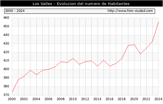 Segun los datos publicados por el INE a 1 de Enero de 2024 el numero de habitantes en Los Valles era de 456, 23 habitantes mas que el en el año 2023. En el grafico siguiente se puede ver cuantos habitantes tiene Los Valles a lo largo de los años.
