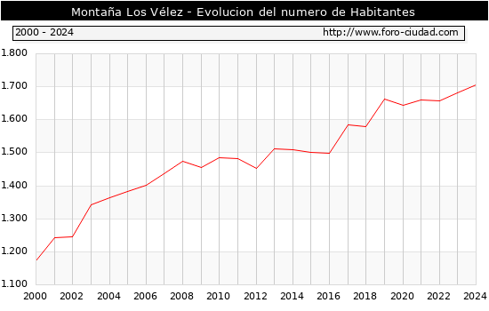 el numero de habitantes en Montaña Los Vélez era de 1.706, 25 habitantes mas que el en el año 2023. En el grafico siguiente se puede ver cuantos habitantes tiene Montaña Los Vélez a lo largo de los años.