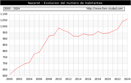el numero de habitantes en Nazaret era de 1.063, 21 habitantes mas que el en el año 2023. En el grafico siguiente se puede ver cuantos habitantes tiene Nazaret a lo largo de los años.
