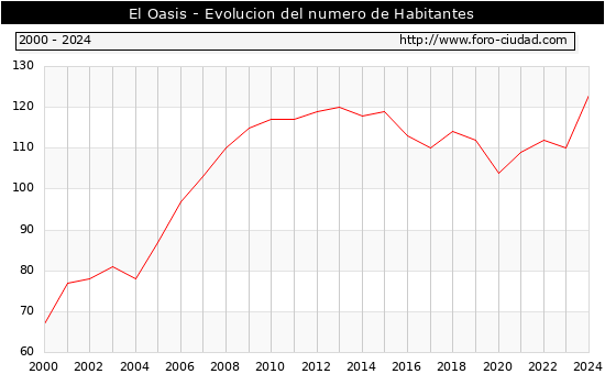 el numero de habitantes en El Oasis era de 123, 13 habitantes mas que el en el año 2023. En el grafico siguiente se puede ver cuantos habitantes tiene El Oasis a lo largo de los años.