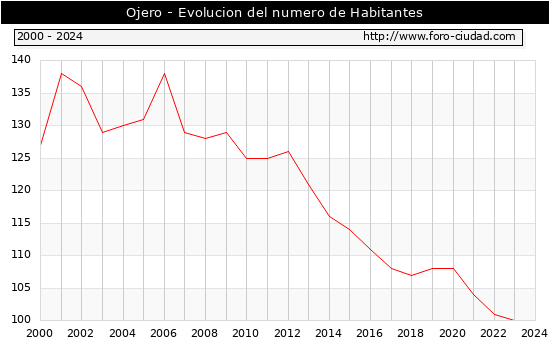 el numero de habitantes en Ojero era de 100, igual numero de habitantes que el en el año 2023. En el grafico siguiente se puede ver cuantos habitantes tiene Ojero a lo largo de los años.