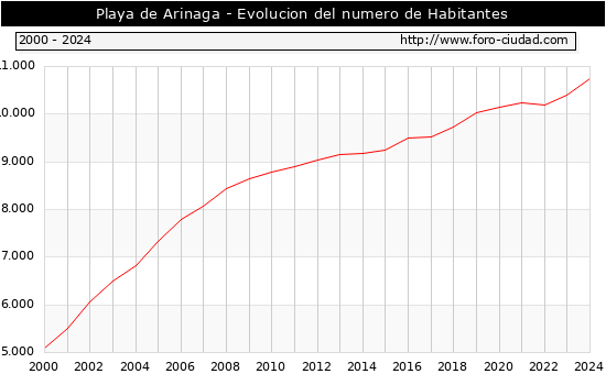 el numero de habitantes en Playa de Arinaga era de 10.743, 341 habitantes mas que el en el año 2023. En el grafico siguiente se puede ver cuantos habitantes tiene Playa de Arinaga a lo largo de los años.