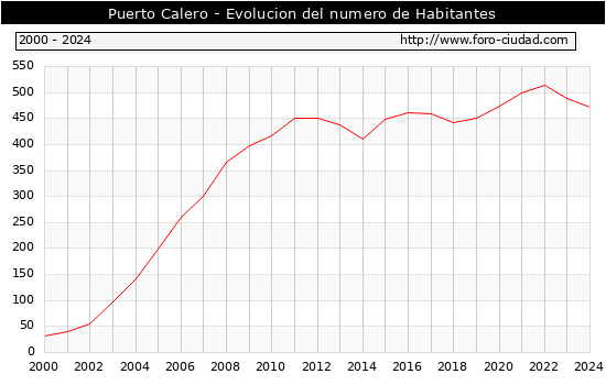 el numero de habitantes en Puerto Calero era de 472, 16 habitantes menos que el en el año 2023. En el grafico siguiente se puede ver cuantos habitantes tiene Puerto Calero a lo largo de los años.