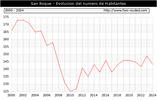 el numero de habitantes en San Roque era de 143, 6 habitantes menos que el en el año 2023. En el grafico siguiente se puede ver cuantos habitantes tiene San Roque a lo largo de los años.