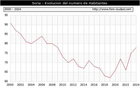 el numero de habitantes en Soria era de 78, 3 habitantes mas que el en el año 2023. En el grafico siguiente se puede ver cuantos habitantes tiene Soria a lo largo de los años.