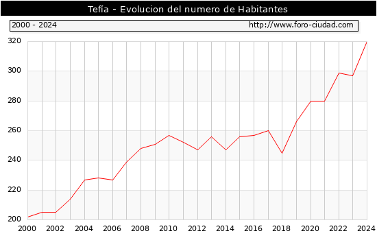 el numero de habitantes en Tefía era de 320, 23 habitantes mas que el en el año 2023. En el grafico siguiente se puede ver cuantos habitantes tiene Tefía a lo largo de los años.