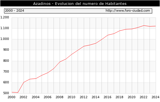 el numero de habitantes en Azadinos era de 1.123, 4 habitantes mas que el en el año 2023. En el grafico siguiente se puede ver cuantos habitantes tiene Azadinos a lo largo de los años.