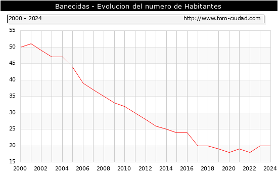 el numero de habitantes en Banecidas era de 20, igual numero de habitantes que el en el año 2023. En el grafico siguiente se puede ver cuantos habitantes tiene Banecidas a lo largo de los años.