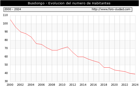 el numero de habitantes en Busdongo era de 39, 1 habitantes menos que el en el año 2023. En el grafico siguiente se puede ver cuantos habitantes tiene Busdongo a lo largo de los años.